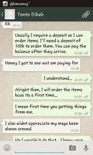 I Am not really the type to keep messages but am glad I did in this particular case..A young lady claims I owe her, as a celebrity,people think it is easy to scare us with the press but am sorry not this time . After stalking my life through social media and text messages,I succumbed to ordering some items from this young lady in a way to support her business,she was truthful that she sold out the originals and convinced me by sending messages of her previous deal with Omotola n few others (messages which i still have but wld respect evry1s privacy n not post but I told her i didn’t want to since i wldnt carry them but she convinced me and since it was my younger friend’s birthday I took pity I asked for the items*