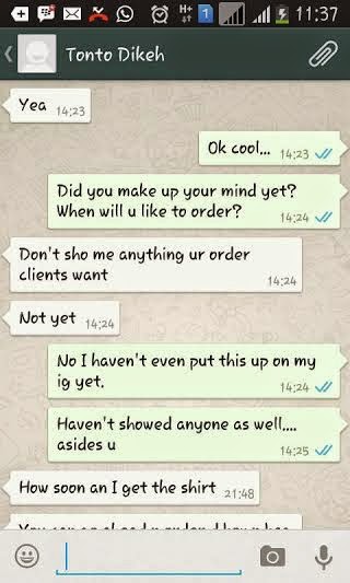 I Am not really the type to keep messages but am glad I did in this particular case..A young lady claims I owe her, as a celebrity,people think it is easy to scare us with the press but am sorry not this time . After stalking my life through social media and text messages,I succumbed to ordering some items from this young lady in a way to support her business,she was truthful that she sold out the originals and convinced me by sending messages of her previous deal with Omotola n few others (messages which i still have but wld respect evry1s privacy n not post but I told her i didn’t want to since i wldnt carry them but she convinced me and since it was my younger friend’s birthday I took pity I asked for the items*