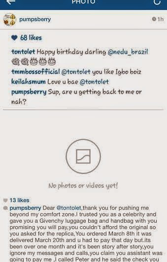 An aggrieved businesswoman and a personal shopper to actress, Tonto Dikeh has called her out on instagram for refusing to pay for the items she ordered for. Simply identified as @Pumpberry on the photo-sharing site, the lady also claimed she gave her a bounced cheque.