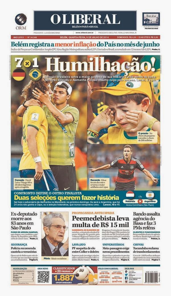 Brazil Vs Germany clash: Front pages of Brazilian newspapers this morning (Photos)