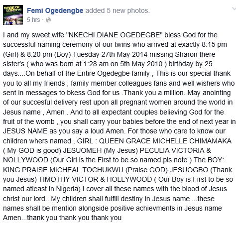 Wait a min! What did actor Femi Ogedengbe name his twins again?