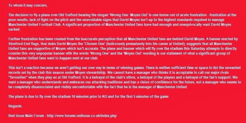 “The decision to fly a plane over Old Trafford bearing the slogan ‘Wrong One: Moyes Out’ is one borne out of acute frustration. It is frustration at the poor results, lack of fight on the pitch and the unavoidable signs that David Moyes isn’t up to the highest standards required to manage Manchester United Football Club. A significant proportion of Manchester United fans have had enough and unequivocally want David Moyes sacked. Further frustration has been created from the inaccurate perception that all Manchester United fans are behind David Moyes……..”