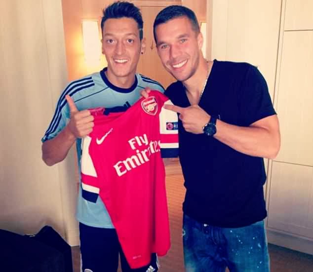 Gareth Bale and Mesut Ozil met their (Arsenal and Real Madrid) new teammates yesterday. Ozil pictured with Oxlaid Chamberlain and Lucas Podolski.
