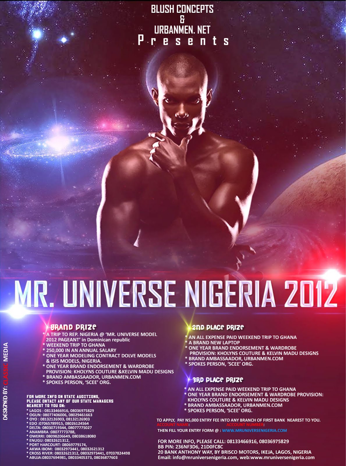Auditions for the forthcoming MR.UNIVERSE NIGERIA 2012; a pageant organized to select' super talents' who will spread their wings in the fashion & entertainment as well as all other business sectors of life will be held in four regions around the country.At the grand finale which takes place on June 16th in Lagos, 25 of Nigeria's most sexiest and intelligent men representing the 6 geographical locations of the country will emerge.AUDITION DATES
