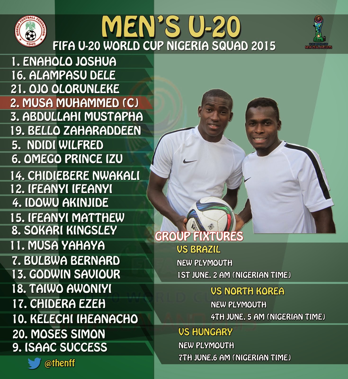 Forwards: Mfon Udoh (Enyimba FC); Gbolahan Salami (Warri Wolves); Ibrahim Shaibu (Giwa FC); Joe Omale (Dekina Dragons); Stanley Dimgba (Warri Wolves); Ezekiel Mbah (Kano Pillars); Onoriode Odah (Enugu Rangers); Azeez Shobowale (Kano Pillars)
