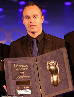 The award is handed over to players aged 28 or over and it is determined by an online poll. Then a panel of journalists select 10 finalists based on personality and achievements. At the 11th edition of the ceremony which took place in Monaco yesterday, Iniesta had a mould of his footprints taken on stage.