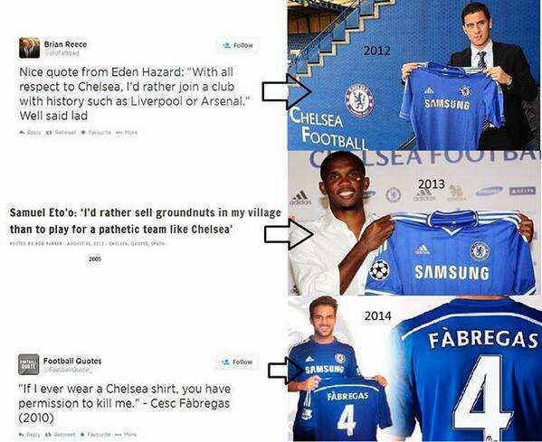 Eden Hazard, Cesc Fabregas and Samuel Eto’o were never fans of Chelsea FC at some points in their lives, not to talk of dreaming of wearing the colours of The Blues. Below are some anti-Chelsea quotes they spewed few years back. Well, tables do turn. And what do we have today? They are all Chelsea players now (well, Samuel has left); talk about eating back their words!