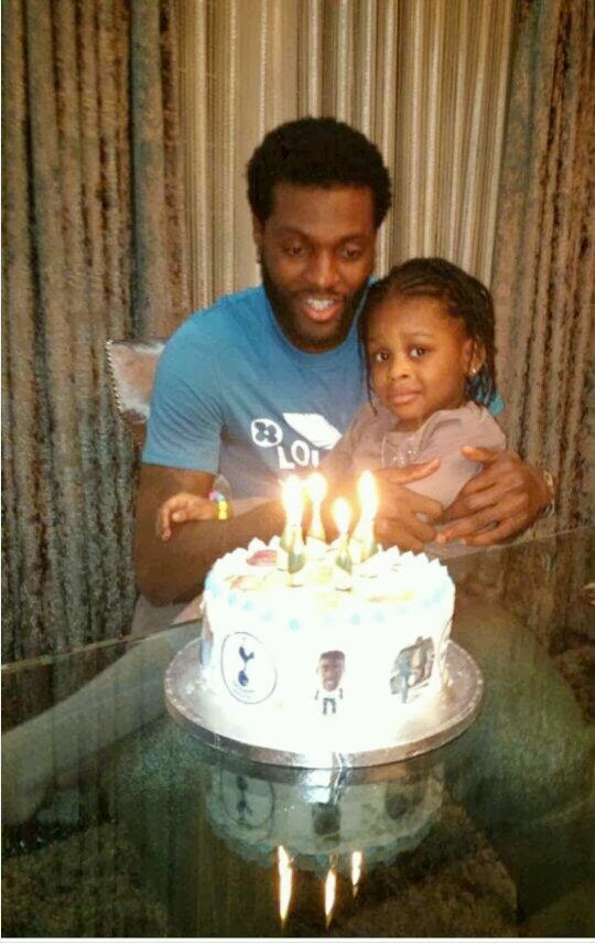 Tottenham striker, Emmanuel Adebayor added a year to his age few days back. The Togolese international revealed how he spent the day. After his training session, he blew out 30 candles at home. Shortly after, he shared a picture of him and his cute,beautiful lass, Kindra with his cake.