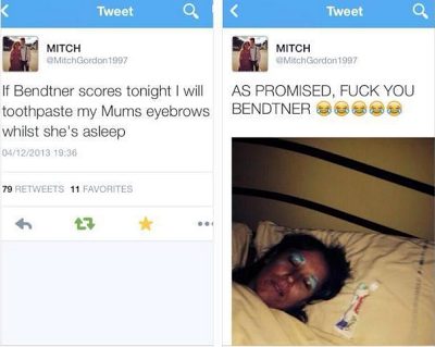 LoL! This kind of bet is funnier and better than putting up a whole house and having your family members thrown out. So this acidic Nicklas Bendtner hater promised “toothpasting” his mum’s eyebrows whilst she’s asleep if Bendtner scored twice during Arsenal’s clash against Hull. He actually posted that on twitter.