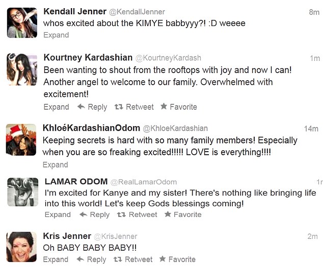Few hours later, her family poured out congratulatory messages via twitter. Grandma Kris Jenner who's expecting her third grandchild was beside herself with joy, "I'm a happy girl !!!!!!!!! Wowza!'