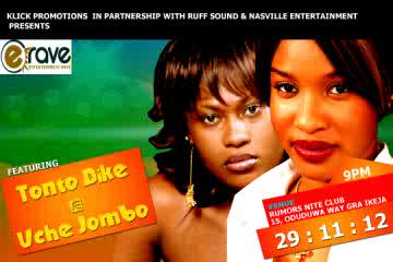 Come this thursday, two of Nollywood's renowned actresses, Tonto Dikeh and Uche Jumbo will be hosted by the biggest entertainment industry weekly celebrity party, E-Rave at Club Rumours, located in Ikeja GRA.