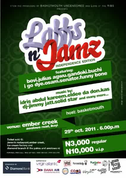 Hosted by one of Nigeria's best comedians, Basketmouth and with other comedy guns like I go dye, Bovi, Buchi, Julius Agwu, Gandoki, Accapella, Mr. Patrick, Senator, Aje Baba,Osam & many more on board, the Independence edition of Laffs n Jamz comedy show is certainly going to shake the roots of Lagos .