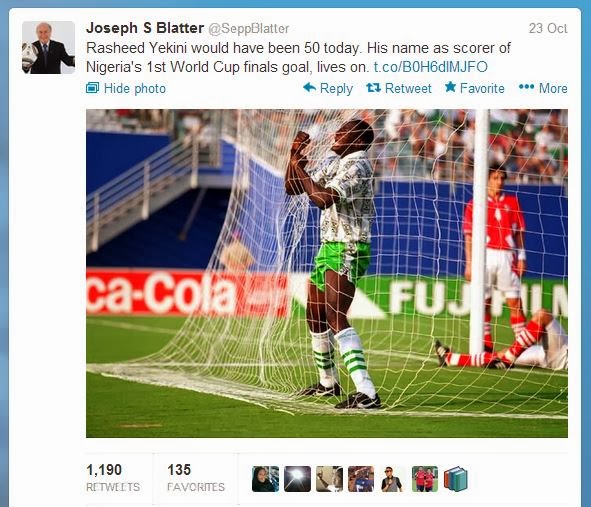 Not a few Nigerians were surprised to read FIFA President, Sepp Blatter's tribute to the iconic sport star two days ago via his official twitter page. He also posted a famous picture of Yekini celebrating a goal during the USA '94 tournament.