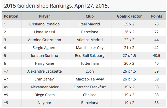 Entertainment Golden Shoe 2014/2015: See the top candidates loladevilleApril 28, 2015, 1:24 pmApril 28, 2015 0 368 Sitting atop the Golden Shoe rankings for 2014/15 season are perennial rivals, Cristiano Ronaldo and Lionel Messi. Only 3 points separate the two world best footballers. See the current top 10 above Previous ArticlePeter Obi’s Appointment as SEC Chairman is his Final Demotion | By: Kinsley UdemezueNext ArticleFederal Government names street after Jonathan, Atiku, Otedola, Dangote others.