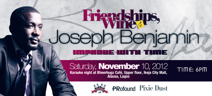 Tagged, 'Friendships wine and Joseph Benjamin, improve with time' the event is taking place at Bheerhugz Cafe, Ikeja Mall, Lagos on Nov.10 by 6pm.