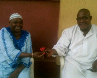 Awwww! Love in the air. Veteran Nigerian actor, Adebayo Salami and his wife Alhaja exchange vals gift.