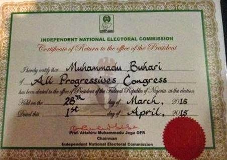 Entertainment See General Buhari's certificate of return loladevilleApril 1, 2015, 2:10 pmApril 1, 2015 0 452 President-elect, General Muhammadu Buhari has picked his certificate of return at the International Conference Centre in Abuja. The document was handed to him by INEC chairman, Prof Attahiru Jega. Previous ArticleFull text of General Muhammadu Buhari's acceptance speechNext ArticlePresidential Poll: Femi Fani-Kayode breaks silence