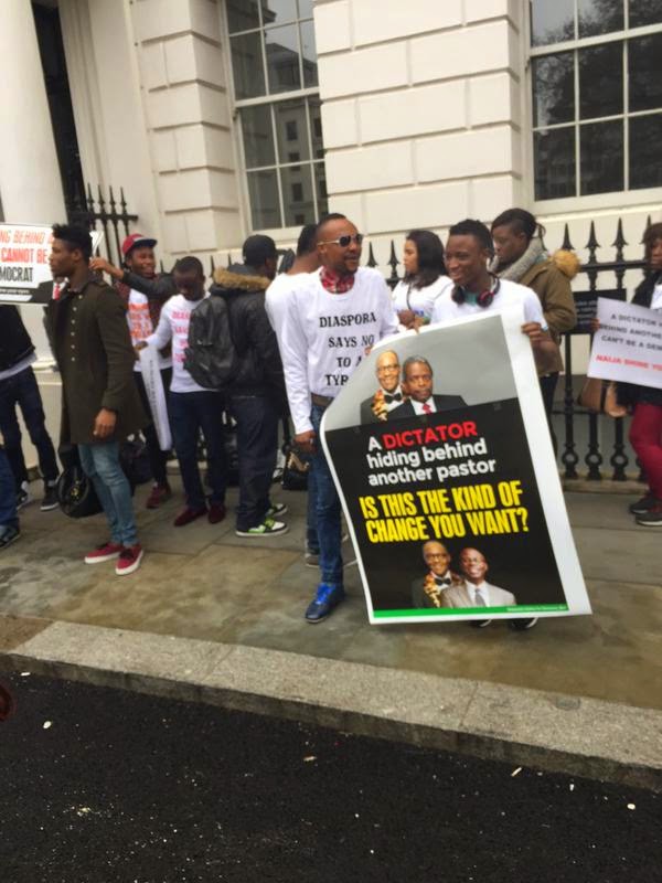 A group of Nigerians in London are currently staging a protest against the presidential candidate of the All Progressives Congress, General Muhammadu Buhari who will speak at Chatham House, United Kingdom today.