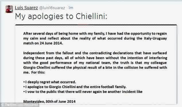 Several days after he was banned from the World Cup by FIFA, Uruguay forward, Luis Suarez has issued an apology to the Italy he bit.