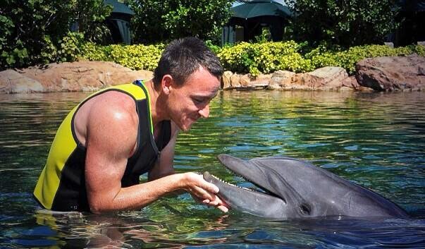 The season is over! For professional footballers around the world, this is the best time to enjoy exuberant getaways anywhere in the world. Chelsea defender, John Terry who has no World Cup to look forward to is currently holidaying in Florida. He was pictured kissing and cuddling with dolphins at the Discovery Cove in Orlando.