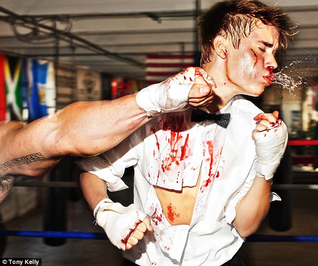 18 year-old Canadian singer Justin Bieber, dressed in a white tuxedo shirt and black bow tie is seen being punched in the jaw and subsequently spits out some blood.