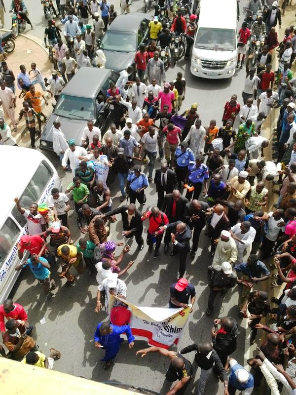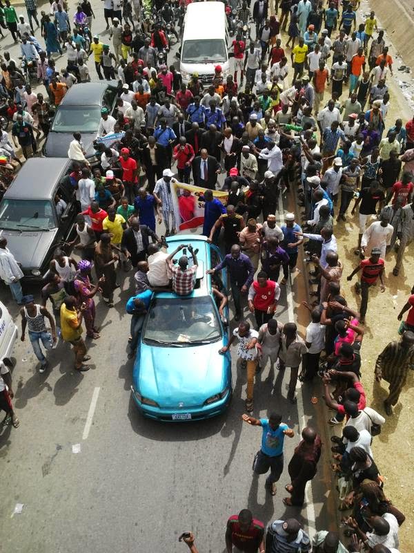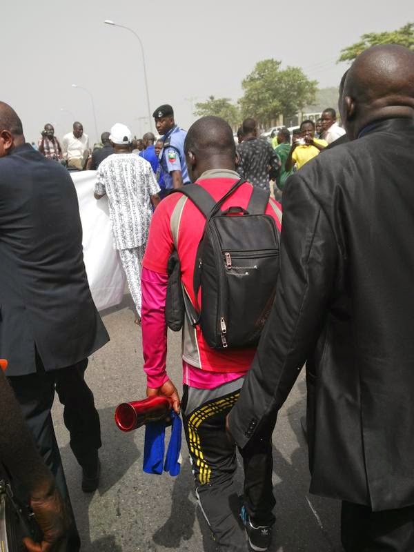 Hasheem Suleiman, the man who trekked from Lagos to Abuja to celebrate General Muhammadu Buhari’s victory in the presidential poll has arrived Abuja. He was treated to a heroic welcome at the Federal Capital Territory today. He will pass the night at the Transport Hilton Hotel, Abuja.