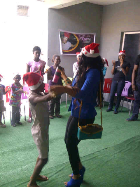 Nollywood actress, Tonto Dike had a swell time yesterday 11th December 2011 at the TROY bar and restaurant located at Ogba. The beautiful actress spent quality time partying with 100 brilliant children, she even gave scholarships to two students.